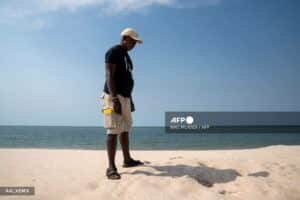 Francois Boussamba, spécialiste des tortues luths, se tient sur la plage du site de nidification, devant un nid de tortues, dans le parc national de Pongara, près de Libreville, le 5 février 2026. Le Gabon accueille quatre espèces de tortues pendant la saison de nidification, d’octobre à avril, le long de ses 900 km de côtes : la tortue verte, la tortue olivâtre, la tortue imbriquée et la tortue luth.