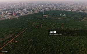 Cette vue aérienne montre la forêt d’Achimota à Accra, le 15 janvier 2026. La forêt d’Achimota, une étendue de verdure dans la capitale du Ghana, sert également de refuge improbable pour les désespérés.