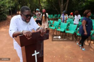 Un pasteur dirige une réunion de prière dans une station de l’enclave de prière de la forêt d’Achimota à Accra, le 15 janvier 2026. (Photo de Nipah Dennis / AFP)