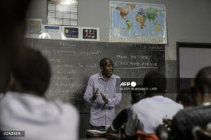 Alphonse (au centre), professeur de français, donne des cours à d’anciens enfants des rues au centre de formation de l’ONG Œuvre de Suivi, d’Éducation et de Protection des Enfants de la Rue (OSEPER) à Kinshasa, capitale de la République démocratique du Congo, le 24 février 2026. La ville de Kinshasa compte plus de 20 000 enfants des rues. L’ONG les accueille dans le but de leur dispenser une formation en menuiserie, boulangerie, coupe et couture, etc., afin de redonner espoir à ces enfants rejetés par la société. (Photo de Glody MURHABAZI / AFP)