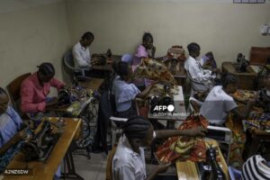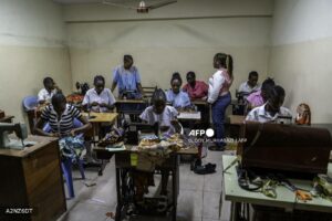 Une jeune fille sortie de la rue apprend la coupe et la couture au centre de formation de l’ONG Œuvre de Suivi, d’Éducation et de Protection des Enfants de la Rue (OSEPER) à Kinshasa, capitale de la République démocratique du Congo, le 24 février 2026. La ville de Kinshasa compte plus de 20 000 enfants des rues. L’ONG les accueille dans le but de leur enseigner la menuiserie, la boulangerie, la coupe et la couture, etc., afin de redonner espoir à ces enfants rejetés par la société. (Photo de Glody MURHABAZI / AFP)