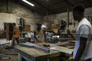 D’anciens enfants des rues apprennent la menuiserie au centre de formation de l’ONG Œuvre de Suivi, d’Éducation et de Protection des Enfants de la Rue (OSEPER) à Kinshasa, capitale de la République démocratique du Congo, le 24 février 2026. La ville de Kinshasa compte plus de 20 000 enfants des rues. L’ONG les accueille dans le but de les former à la menuiserie, à la boulangerie, à la coupe et à la couture, etc., afin de redonner espoir à ces enfants rejetés par la société. (Photo de Glody MURHABAZI / AFP)