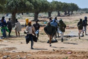 Les gens s’enfuient alors que la police tunisienne arrive pour dรฉmanteler un campement de fortune pour migrants d’Afrique subsaharienne ร al-Amra, dans la banlieue de la ville portuaire tunisienne de Sfax, le 5 avril 2025. La Tunisie a commencรฉ le 4 avril ร dรฉmanteler les camps abritant des milliers de migrants sans papiers d’Afrique subsaharienne, a dรฉclarรฉ la police, ร la suite d’une campagne menรฉe contre eux sur les rรฉseaux sociaux. (Photo de FETHI BELAID / AFP)