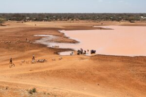 Vue gรฉnรฉrale d’un bassin d’eau en train de s’assรฉcher, seule source d’eau restante pour les habitants et leur bรฉtail du village de Lulis, prรจs de Banissa, le 20 janvier 2026. Dans le nord-est du Kenya, frappรฉ par la sรฉcheresse, les villageois ont รฉtรฉ contraints de traรฎner leur bรฉtail mort vers des champs รฉloignรฉs pour le brรปler afin d’รฉloigner de leurs maisons l’odeur de la mort et les hyรจnes charognardes.