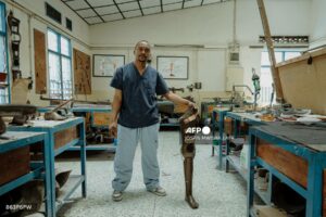 Mathieu Bitegethimana, head of department and ortho-prosthetist technician, poses for a photograph in the prosthesis rectification room of the Shirika la Umoja centre in Goma, on November 19, 2025.  (Photo by Jospin Mwisha / AFP)