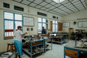 André Mbuguja (C) and Wivivine Mukata (L), two ortho-prosthetist technicians who are also persons with disabilities and former beneficiaries of the centre’s care, work on an orthosis and a prosthesis for a patient in the fitting room of the Shirika la Umoja centre in Goma, on November 19, 2025. . (Photo by Jospin Mwisha / AFP)