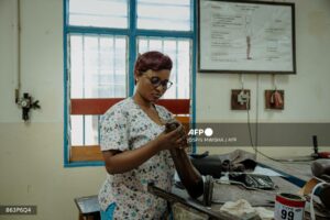 Andre Mbuguja, an ortho-prosthetist technician who is also a person with disabilities and a former beneficiary of the centre’s pose after care, tightens an angle on the modal transfer device (the knee joint of the prosthesis) intended for a patient, in the fitting room of the Shirika la Umoja centre in Goma, on November 19, 2025.