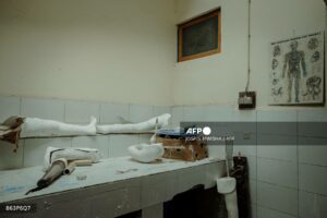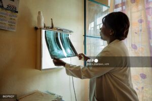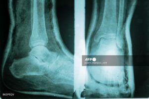 A general view of a control x-ray of a disabled patient displayed on the negatoscope after an imaging exam showing a fibula fracture, at the Shirika la Umoja centre in Goma, on November 20, 2025. (Photo by Jospin Mwisha / AFP)