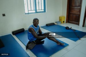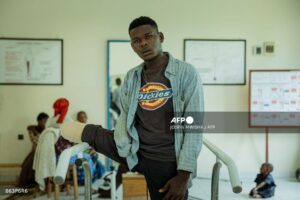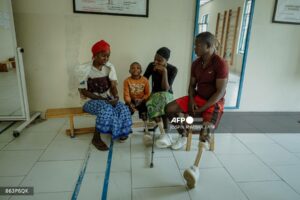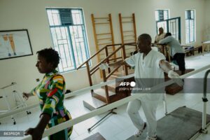 Patrick Ndagije’s mother, from Bishushe in Rutshuru territory and injured by a bullet in 2024, sits beside other patients with disabilities, in the gait rehabilitation room at the Shirika la Umoja centre in Goma, on November 19, 2025. (Photo by Jospin Mwisha / AFP)