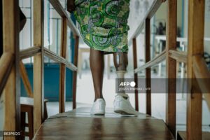 A patient tests her new prosthesis at the Shirika la Umoja centre in Goma, on November 19, 2025.