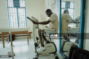 A young patient who lost a limb sits on a pedal sports bike and pedals to strengthen his new prosthesis after it was adjusted to his body, at the Shirika la Umoja centre in Goma, on November 19, 2025.